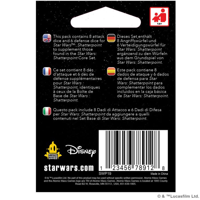 Players can supplement their collection of Star Wars: Shatterpoint with this pack. Containing 8 attack dice and 6 defense dice identical to those foun