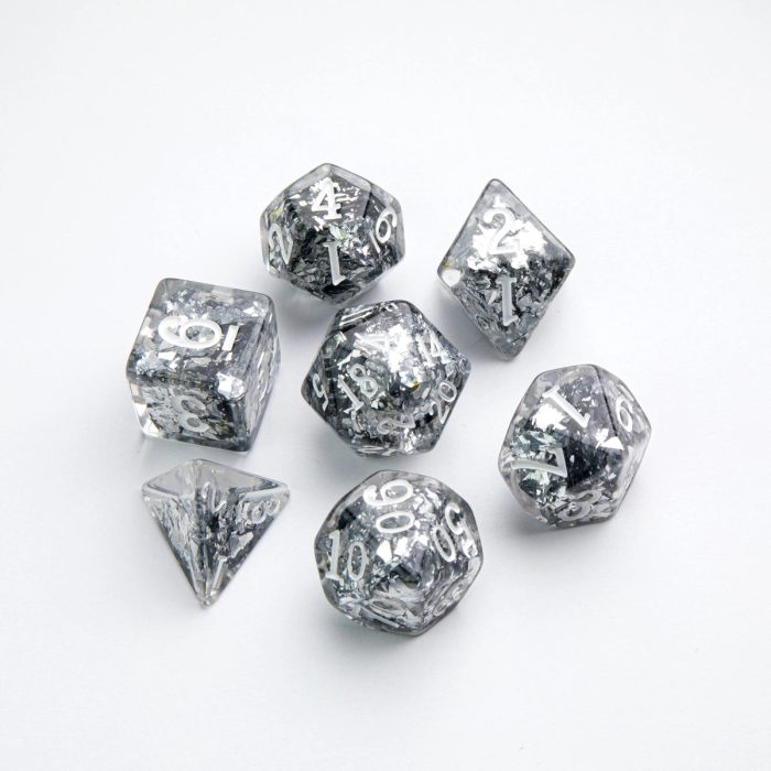 FEATURESSet of 7 premium quality resin diceCANDY-LIKE SERIES: infused with beautiful glitter flakesPack contains D4, D6, D8, D10 (10 and 00), D12 and