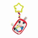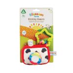 Brightly coloured soft camera toy with textured c-clip for on-the-go discovery