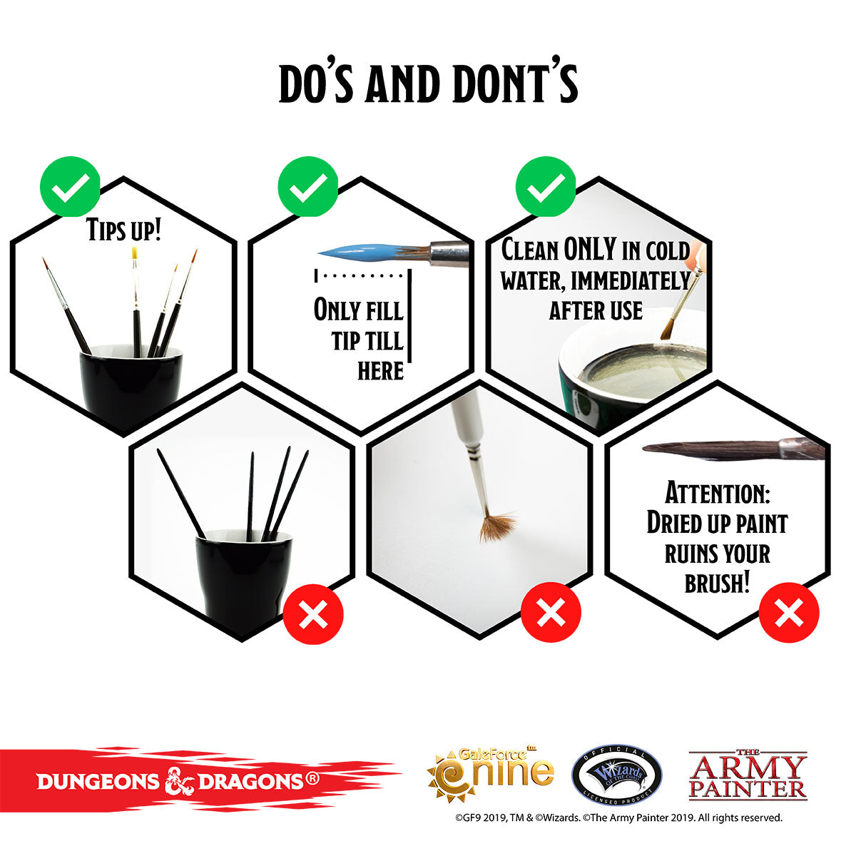 Stylish beginner gift set – The stylish black brush handles, decorated with D&D prints, make this brush set an attractive gift set for any hobby painter and role-player.