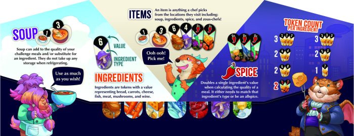 Challenges, revealed in rounds 1 through 6, offer the players opportunities to earn stars for crafting dishes with specific ingredient requirements. After round 7 the players must create an epic meal to impress the celebrity critic and cater to their appetites. A multitude of different critics, rumors and restaurateurs mean every game is fresh!