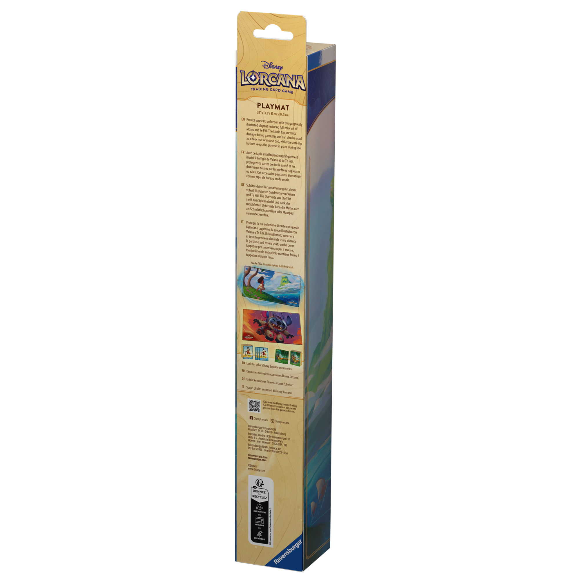 Protect game cards during play and personalize play space with these stunning full-sized playmats. One design features Disney’s Moana and Te Fiti, and the other features Disney’s Stitch.