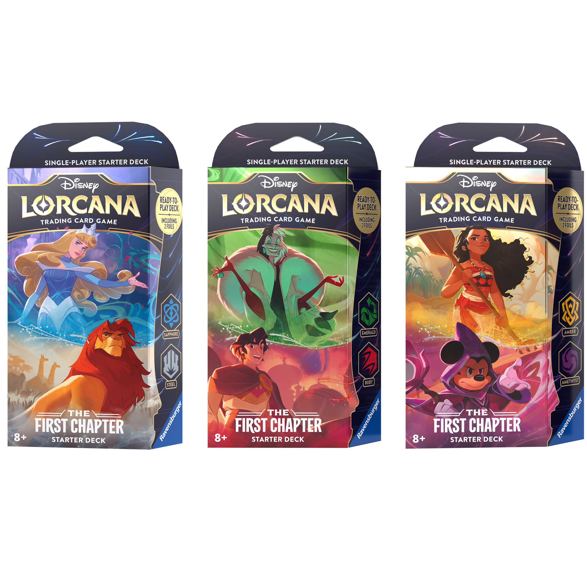 This is a bundle product that includes one copy of each The First Chapter Starter Decks (Amber/Amethyst, Emerald/Ruby and Sapphire/Steel)
