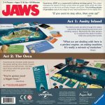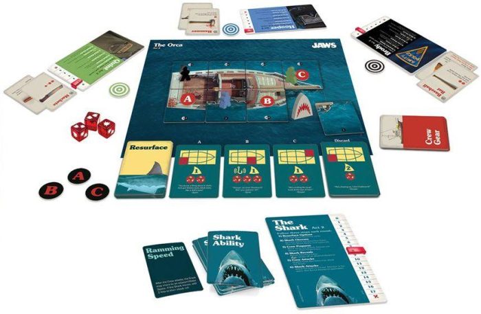 In Jaws, one player takes on the role of the killer shark off Amity Island, while the other 1-3 players take on the roles of Brody, Hooper and Quint to hunt the shark. Character and event cards define player abilities and create game actions for humans and the shark. Gameplay is divided into two acts — Amity Island and The Orca — to replicate the films story.