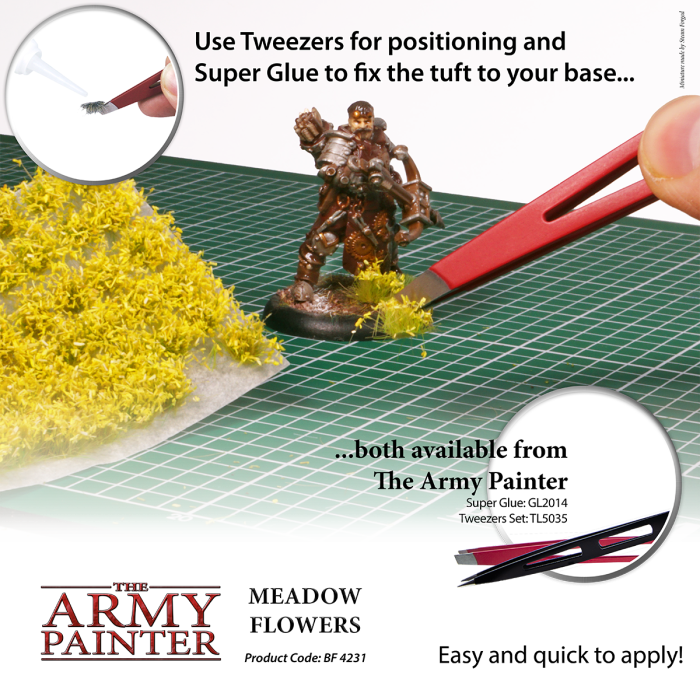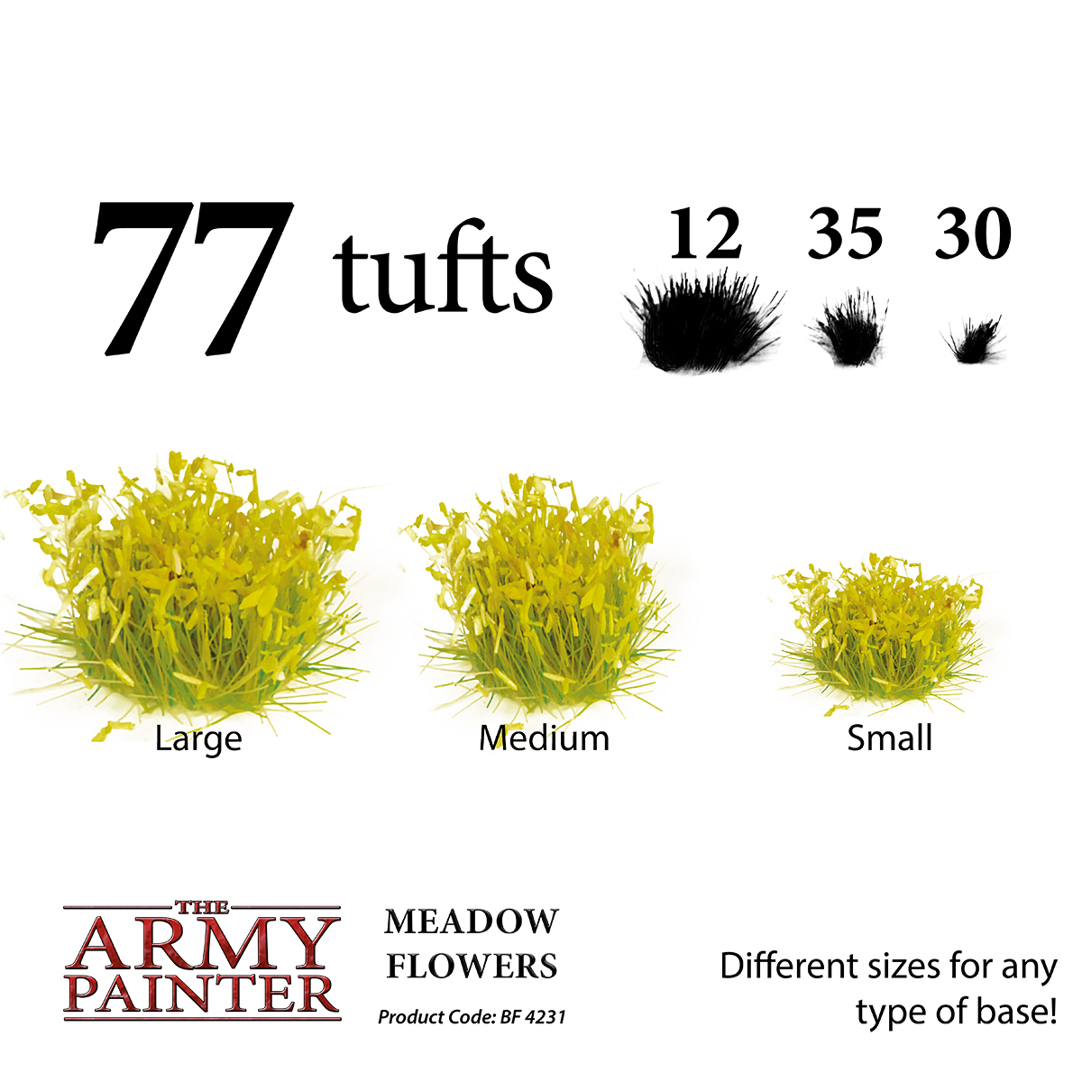 Lovely and idyllic flowery meadows… do not let your guard down, though! Can be used as contrast to evil armies – or to enhance a forest or glades look. Super realistic looking and comes in 3 different sizes for any base size. Attach easily with the help of our Tweezer Set and Super Glue.Contains 77 tufts.