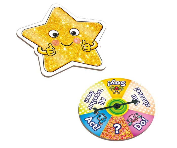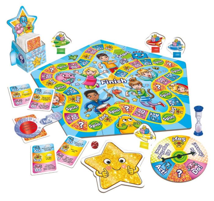 Be a star and rise to the challenge of this exciting family board game! Race your way around the performance board to be the first player or team to reach the finish, with lots of un noises, actions and activities along the way! Can you pretend to be a monkey, make a noise like a firework or wiggle your ears? If you can’t, use the magic decoder and reveal your hidden forfeit on the back of the cards!