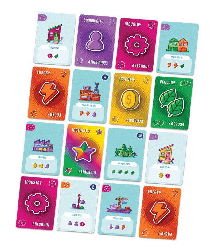 The rules are simple: Take two adjacent cards from the dynamic city grid and add them to your expanding city. Use your resource cards and bonuses to construct building cards that require specific combinations. Build special civic structures to multiply your city’s points and be the top urban planner!