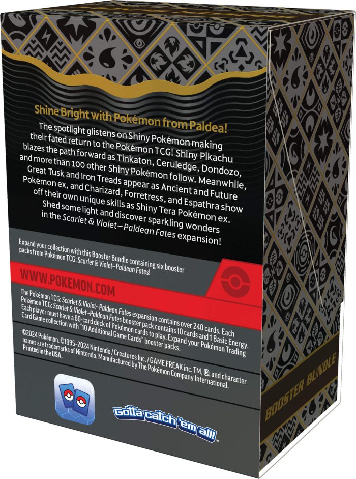 The spotlight glistens on Shiny Pokémon making their fated return to the Pokémon TCG! Shiny Pikachu blazes the path forward as Tinkaton, Ceruledge, Dondozo, and more than 100 other Shiny Pokémon follow. Meanwhile, Great Tusk and Iron Treads appear as Ancient and Future Pokémon ex, and Charizard, Forretress, and Espathra show off their own unique skills as Shiny Tera Pokémon ex. Shed some light and discover sparkling wonders in the Scarlet & Violet—Paldean Fates expansion!
