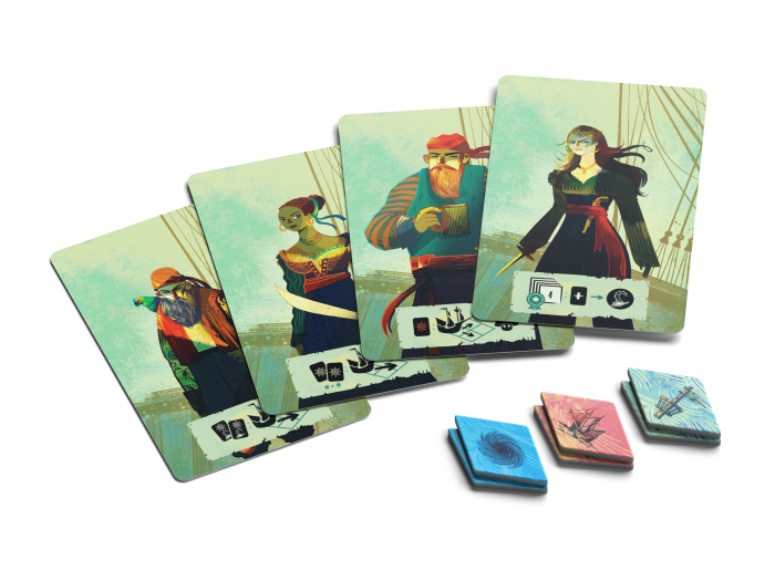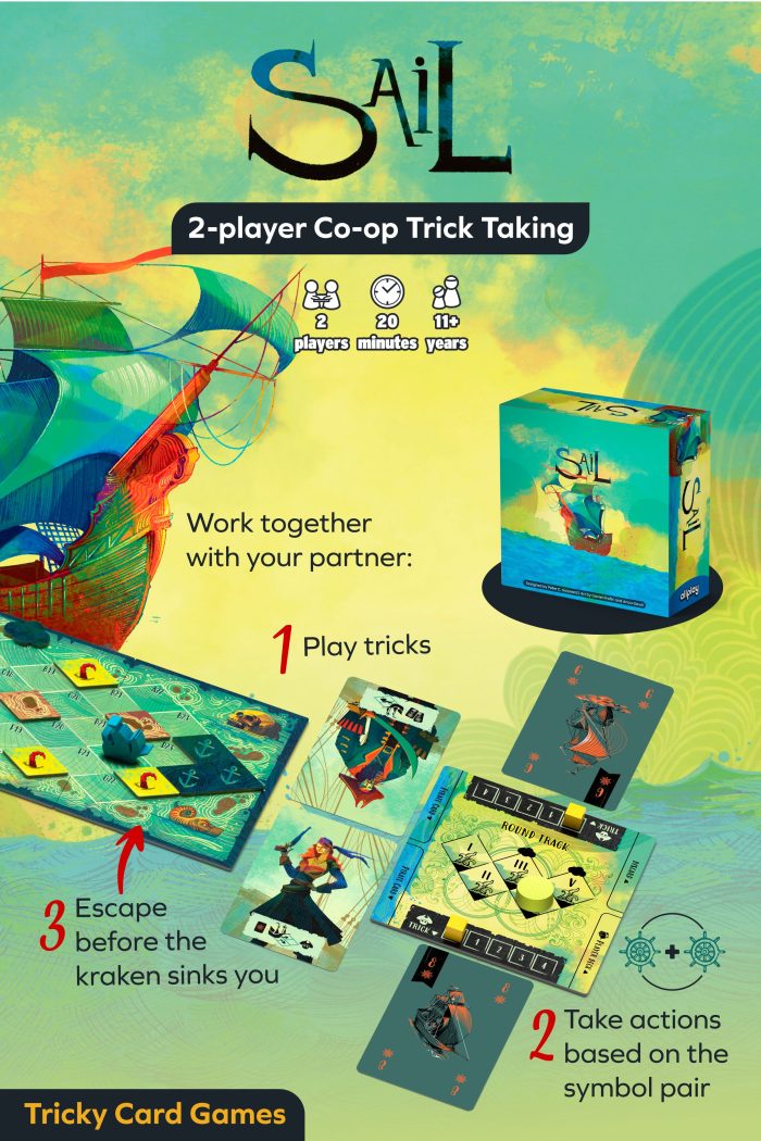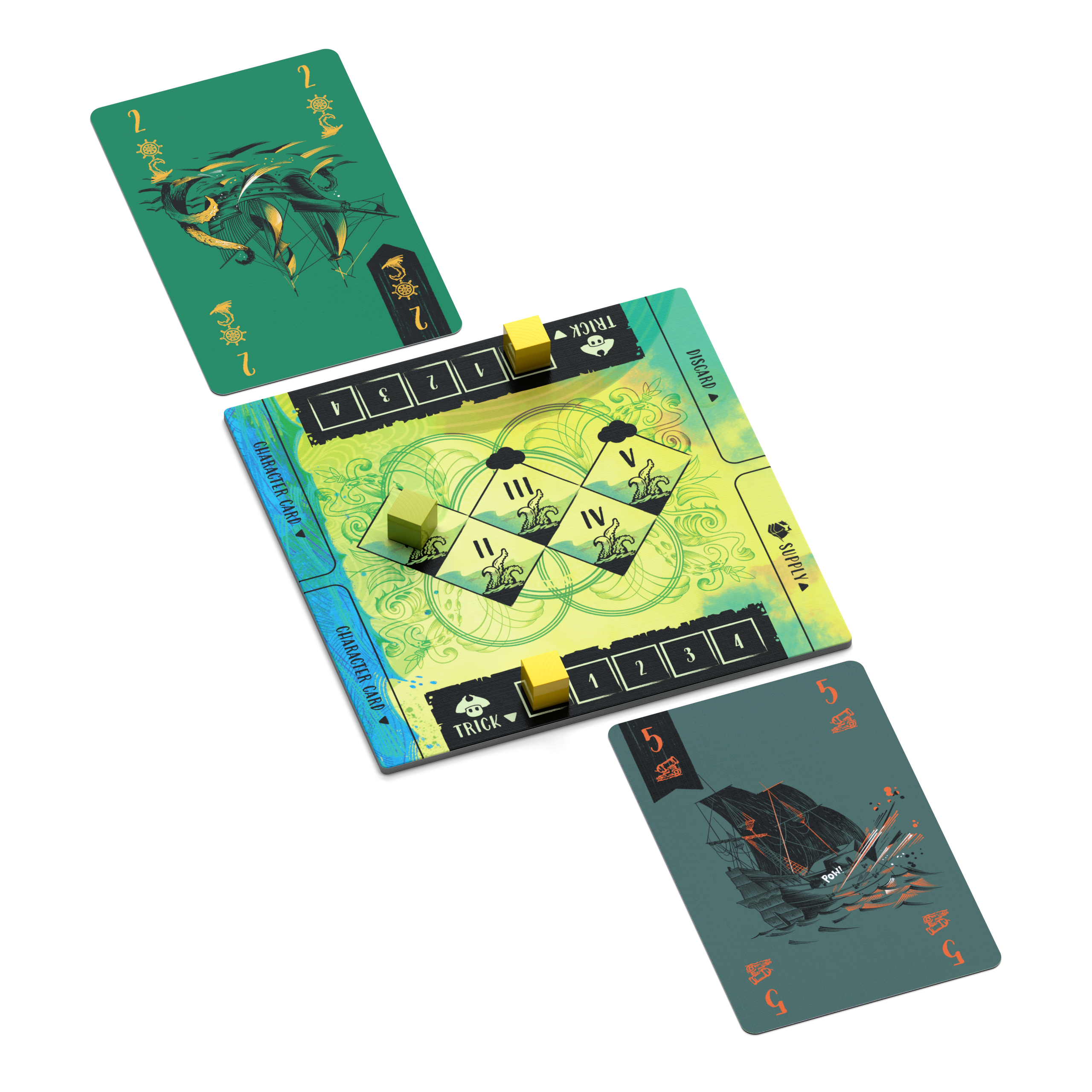 Strap on your eye patch and navigate your ship through turbulent waters in this cooperative trick-taking 2-player game! Reach the end of this dangerous deep end, and avoid taking damage from the Kraken to win the game together, or your crew will be sleeping with the fishes!