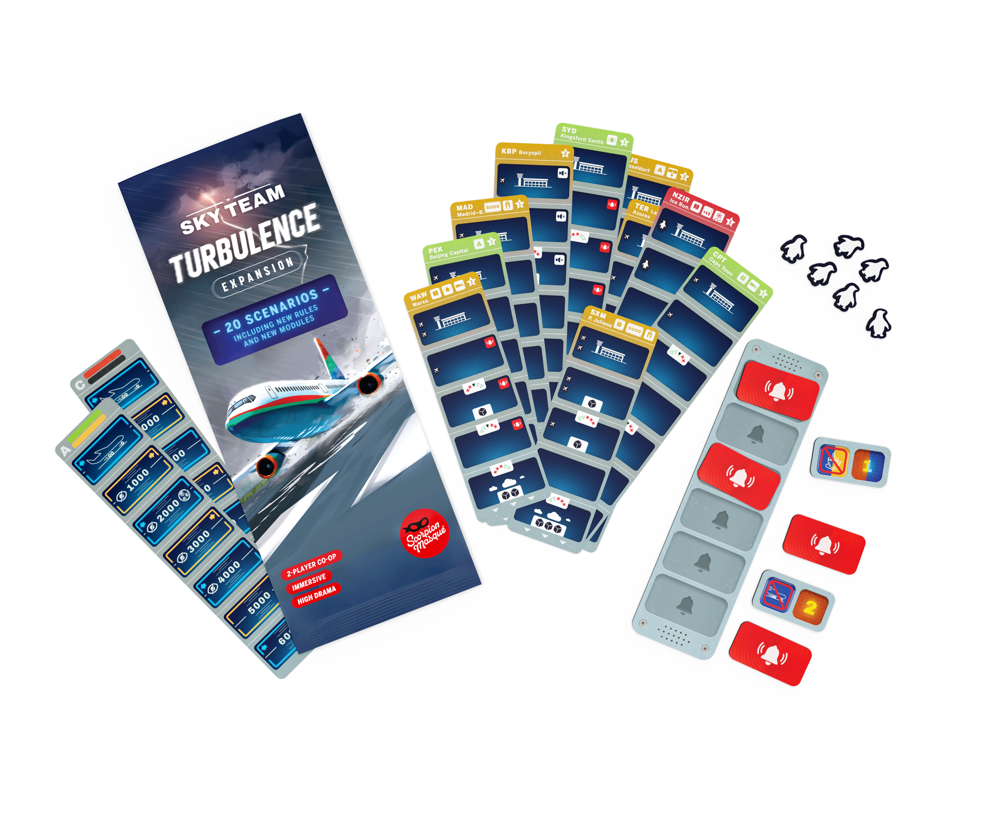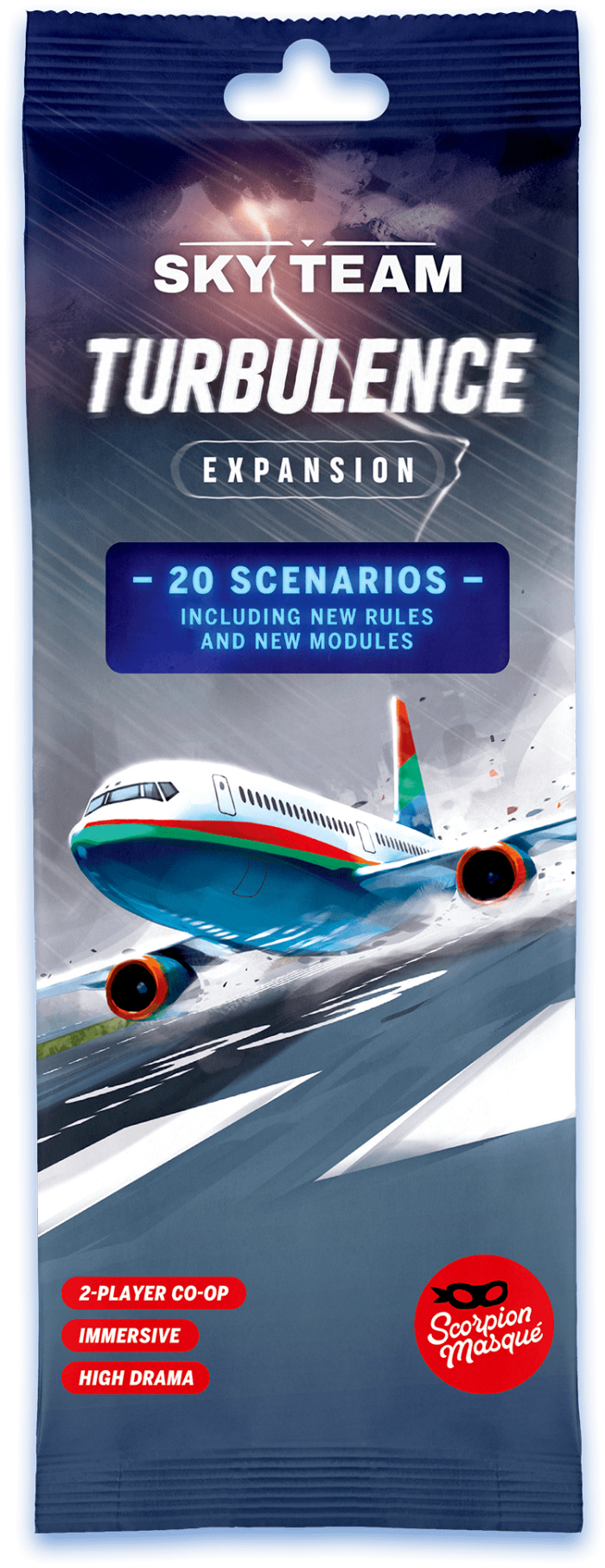 Take your seat in the cockpit and test your skills in 20 scenarios that are even more demanding! Turbulence introduces new rules and new modules, such as Turbulence, Low Visibility, and Alarms, that will add depth and diversity to your Sky Team base game.Now boarding for such wonderful destinations as Beijing, Madrid, Warsaw, Sydney, Cape Town, Kiev, and Saint Martin.
