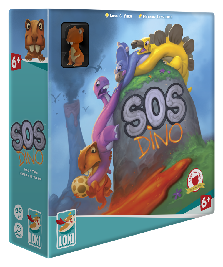 SOS Dino is a cooperative game in which players have to move the cute dinosaur figurines to help them escape the flowing lava. At your turn, take a random tile in the bag, place it on the board and carry out the action printed on the tile. Throughout the game, move each dino to safety on top of the mountains, while gathering the eggs scattered throughout the land.