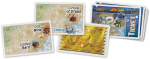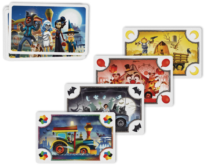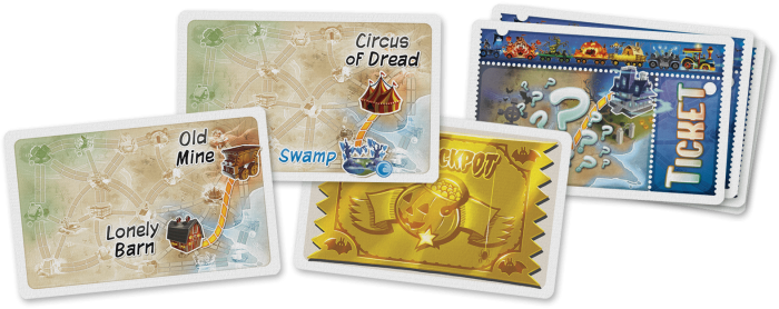 On a turn, you either draw two parade float cards from the deck or discard parade float cards to claim a route between two locations by placing your ghost trains on it; for this latter option, you must discard cards matching the color and number of spaces on that route (e.g., two yellow cards for a yellow route that’s two spaces long). If you connect the two locations shown on a ticket with a path of your trains, reveal the ticket, place it face up in front of you, then draw a new ticket. (If you can’t connect locations on either ticket because the paths are blocked, you can take your entire turn to discard those tickets and draw two new ones.)
