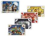 In general, players collect parade float cards, claim routes on the map, and try to connect locations such as the Mad Scientist’s Lab, the Gingerbread House, and the Lonely Barn that are shown on their tickets. In more detail, the game board shows a map of a city with certain locations being connected by colored paths. Each player starts with four colored parade float cards in hand and two tickets; each ticket shows two locations, and you’re trying to connect those two locations with a contiguous path of your trains in order to complete the ticket.