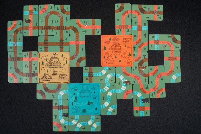In Trailblazers, players compete to earn the most points by building biking, hiking, and kayaking loops from their campsites of the matching trail type. Each round, players are dealt eight trail cards where they willll draft two cards, arrange those cards in their personal area, and pass their hand to the next player three times. Cards must either be placed adjacent to or overlapping other cards. While players can push their luck by aiming to construct long and elaborate trails, only closed loops that start and end at a matching campsite will score points. Players also compete to fulfill Goal cards. After four rounds, the game ends and the player with the most points from closed loops and goal cards wins.