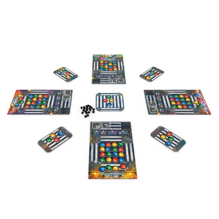 In this abstract strategy game, players aim to complete Figures using 4 Umbrellas of the same color. They slide Umbrellas from Waiting Zones onto their 4×4 grid, consequently sliding Umbrellas off of their Stage. After sliding, if their Stage matches a Figure Tile, they place a token on their scoring board and cover up the color used to complete it. They then pass the completed Figure Tile to the next player. The game end is triggered in 3 different ways, and points are earned through scoring tokens, bonuses, and empty Personal Waiting Zones. The player with the most points wins!