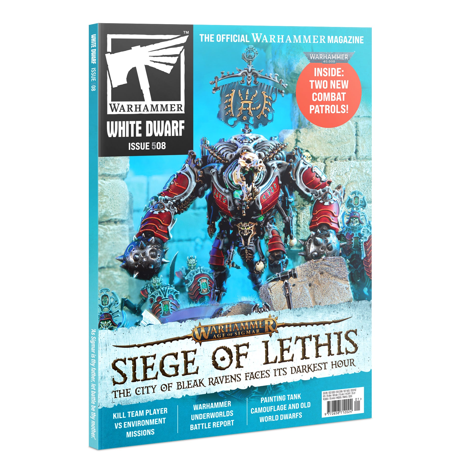 White Dwarf is the official Warhammer magazine, packed with amazing monthly content – including new rules and background, short stories, regular columns, special guests, and more.Here’s what you can look forward to in January’s issue:Planet WarhammerLetters, questions and pictures of miniatures sent in by readers.WARHAMMER AGE OF SIGMARBattle Report: Clash in the MineThe Emberwatch take on Zikkit’s Tunnelpack in the new edition of Warhammer Underworlds.Flashpoint Lethis: The Battle of Lake LethisThe City of Ravens faces its darkest hour as the Petrifex Elite storm the barricades.Flashpoint Lethis: Siege of LethisExperience the cataclysmic events in Lethis with a siege battleplan.Fantastic War Hosts: Daughters of KhaineMorathi’s kin revel in their magnificence in a stunning gallery of models.Basic TrainingIs your warhammer Anti-X, Crit, or +1 Damage? It’s time to learn about weapon abilities.WARHAMMER 40,000Hobby HangoutIt’s a painting article all about tank camo. Wait, where’s it gone? It was there a second ago…The Weapon WorldJourney to the planet of Volkus where the Great Gun stands sentinel over all.Combat Patrol: The Gorgonne’s StrikeNew Combat Patrol rules for Tempestus Scions and entirely unhinged Necrons.OTHER ARTICLESBugman’s BelterLyle meets some Blood Bowl tournament newcomers and shares their experience.Brush TipsThe ’Eavy Metal team share their wisdom on painting Old World Dwarfs. Beards abound!Armies of the Old WorldFour mighty generals showcase their finished armies. Well, finished for now…Tatters of Hope Pt 3In this month’s instalment, the Tattershields are pinned down by a heretic sharpshooter.WHITE DWARF BUNKERAccess GrantedAn introduction to the new-look Bunker.Car ShowPolish your exhausts and touch up your go-faster stripes – it’s time for the Car Show!Bunker MissionsA player vs environment mini-campaign for Kill Team. The cards are supplied in this issue!Satellite UplinkGet in line you ‘orrible lot, because this month’s painting challenge is Rank and File units.Bunker Bingo!It’s a new year and a new bingo sheet. Some of the Dwarfers are already out of the gate!Each copy of White Dwarf 508 also comes with a cardboard insert containing a 15x card deck of Relic Ploy cards for Kill Team, 1x Bunker Rank card, and a pull-out card featuring the scenarios of the month for Warhammer Age of Sigmar and Warhammer 40,000.