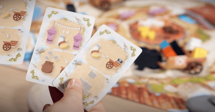 Over the course of the game, each player builds their own stone tower by acquiring stones from visiting merchants. You start the game with one good of each type (meat, milk, bread) and three cards in hand: build, restock, and market. Three or four carts being pulled by yaks start on the game board, with each player having one cart in front of them and each cart containing three stones and some food. Each cart has a restriction on it, e.g.,