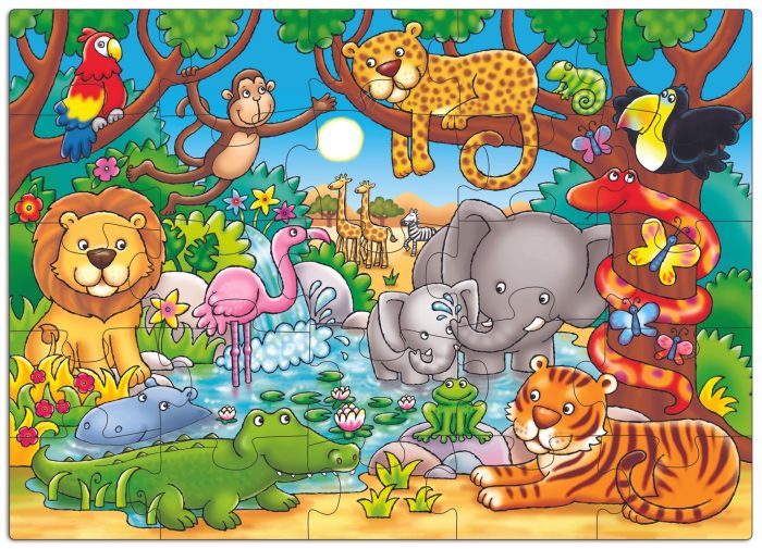 This colourful 25-piece jigsaw features a busy jungle scene with lots of wild animals to spot, including tigers, lions, elephants, monkeys and crocodi
